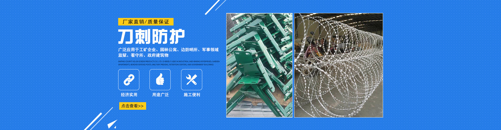 安平初日絲網(wǎng)有限公司主要產(chǎn)品有刀片刺繩、刺絲滾籠、刺繩支架、護(hù)欄網(wǎng)、隔離網(wǎng)、球場圍網(wǎng)等多種產(chǎn)品,公司擁有先進(jìn)的生產(chǎn)設(shè)備和技術(shù),以“質(zhì)量求生存,信譽謀發(fā)展”為生產(chǎn)原則,為新老用戶提供高質(zhì)量產(chǎn)品。